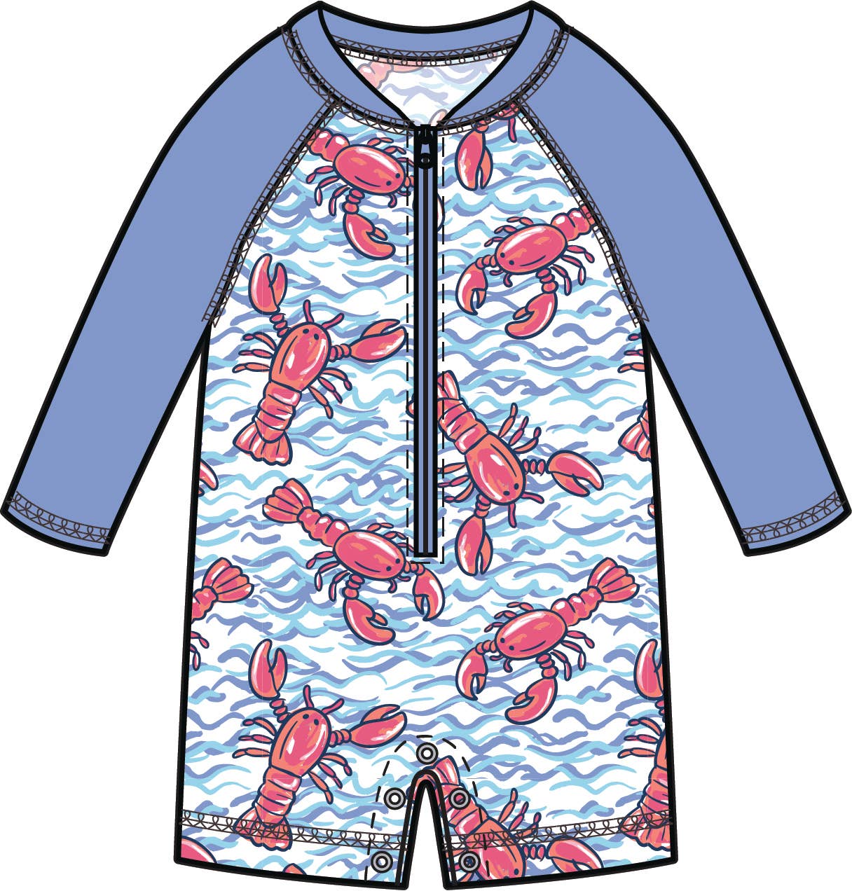 Keep your little guy safe from the sun with this UPF 50+ Boys Long Sleeve One Piece Rash Guard. This full coverage one piece suit makes trips to the pool, lake or beach so easy for little crawlers. Snaps at bottom make for easy changing. Made with sun protected fabric for all day protection and comfort. Adorable hand-drawn lobsters dance across ocean waves in this sweet coastal-inspired print! Perfect for beach vacations, crawfish boils, or even the 4th of July! Pairs well with Blue Breeze, Periwinkle Blue, Coral, White, Pink Lobster Lagoon. Care Instructions: Hand wash cold with like colors; do not bleach; do not iron; line dry in shade Fabric Content: 80% Nylon, 20% Spandex Reference Code: B1230