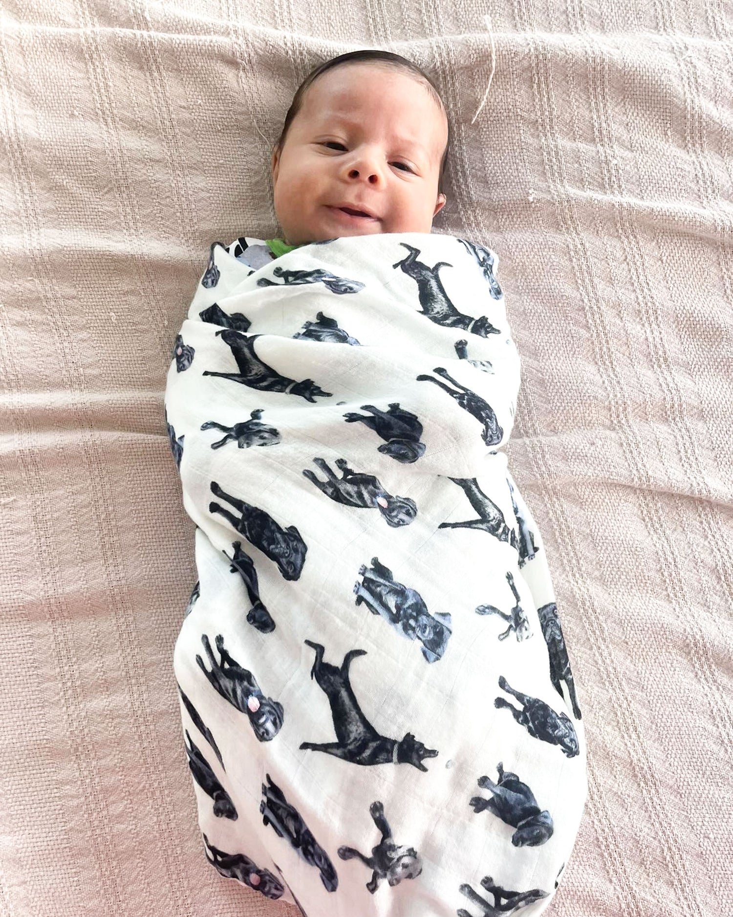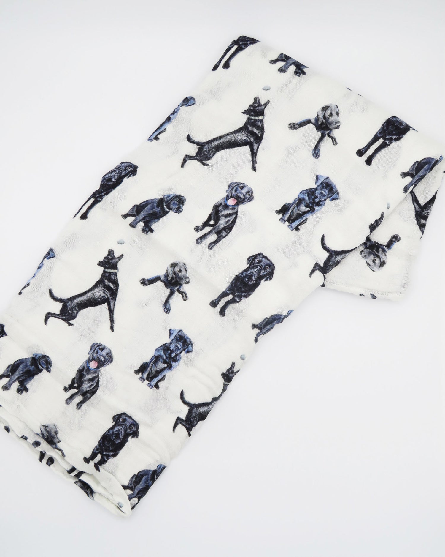 Calling all Black Lab lovers! Our hand-painted Black Lab swaddle, crafted from a luxurious blend of 30% organic cotton and 70% bamboo, offers the perfect blend of comfort and style for your little one. Wrap your baby in the best with this unique design by Charlotte, featuring adorable black labs.