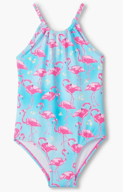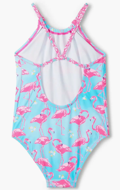 Make your little one's seaside days memorable in this fab flamingo-themed one-piece swimsuit trimmed with contrast drawstring-neck straps that form a sporty racerback