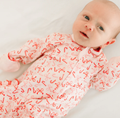 Make dressing and undressing a breeze with this precious zip footie, crafted from luxurious Pima Cotton. It features a charming all-over print of candy canes and bows and a convenient zipper on the front, making it a comfortable and convenient choice for your little one this holiday season.