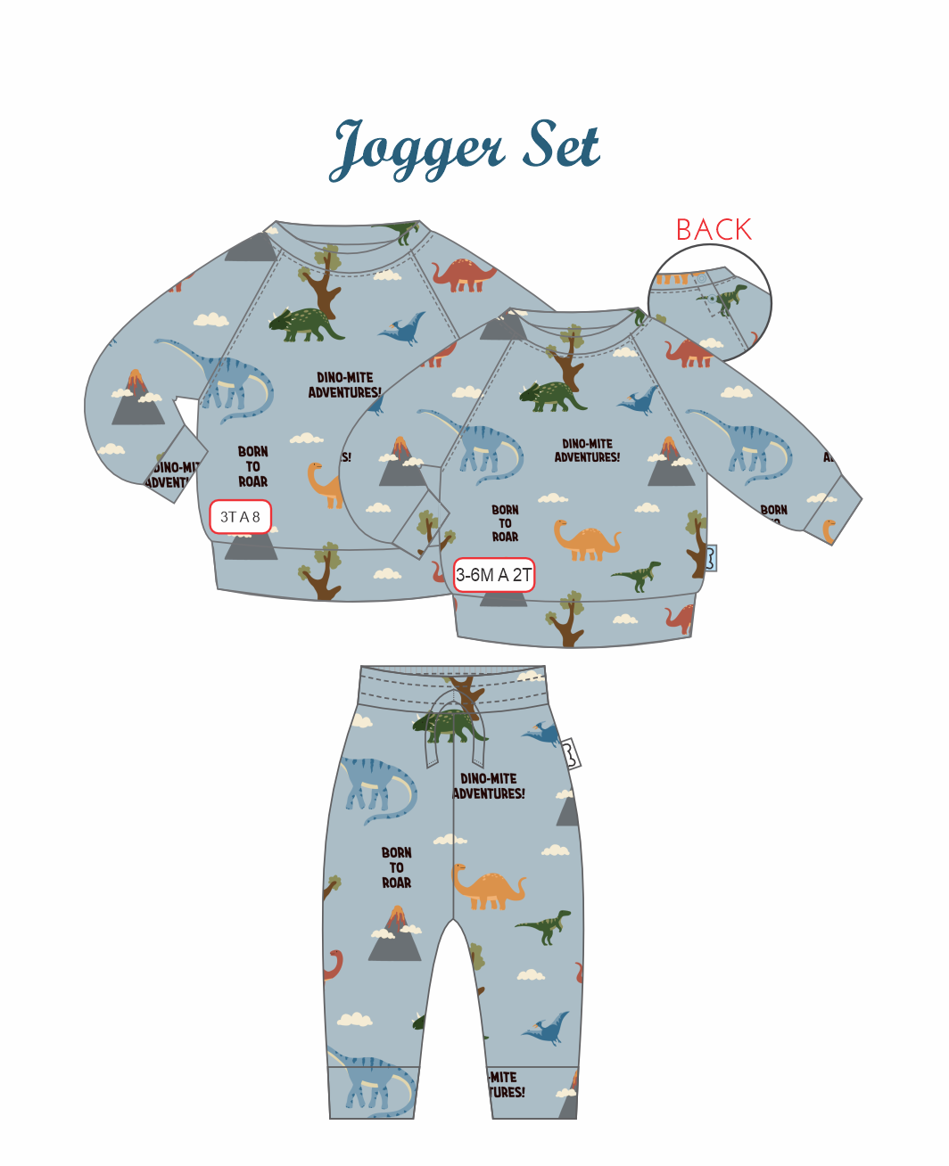 Get your little explorer ready for a dino-mite adventure! Our Dino Jogger Set features a soft, cozy fabric in a playful blue base, covered in colorful dinosaurs, erupting volcanoes, and cheerful messages like "Born to Roar" and "Dino-Mite Adventures!" This two-piece set includes a long-sleeve top with easy shoulder snaps and matching joggers with a comfy elastic waistband—perfect for crawling, playing, or roaring around the house.