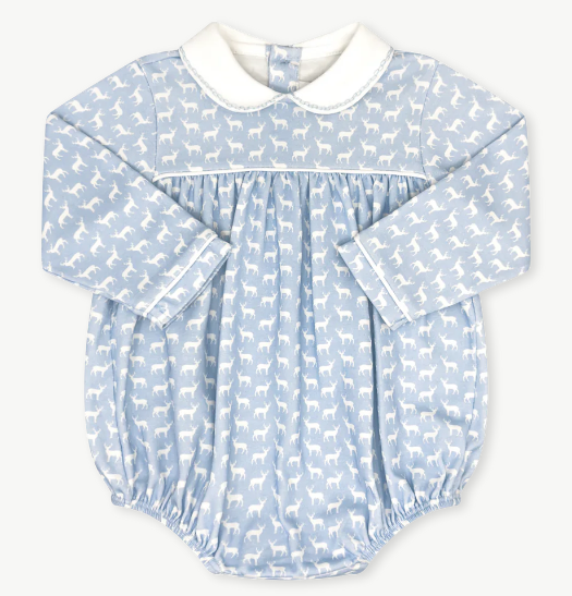 Our Lullaby Set classic Covington Bubble Long Sleeve is now available in our custom My Deer print in knit with blue feather stitching trim. This dreamy bubble creates a stylish look for your little one's playful adventures.