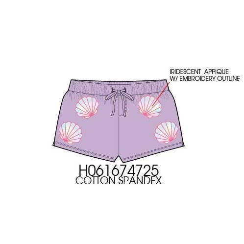 Tween cotton spandex short adorned with seashells applique and embroidery details on the front.